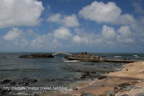 步出石門洞,往右方小徑行去,可見不遠處的海面上,有一白色拱橋橫臥於兩塊礁岩之間;以白橋為界,萬頃碧波,頓成兩個世界;橋之外,不時波濤洶湧,橋以內,卻始終風平浪靜;相傳此因白橋有一神祇駐守,常年眷戀呵護這片海域,不使情海生瀾之故……